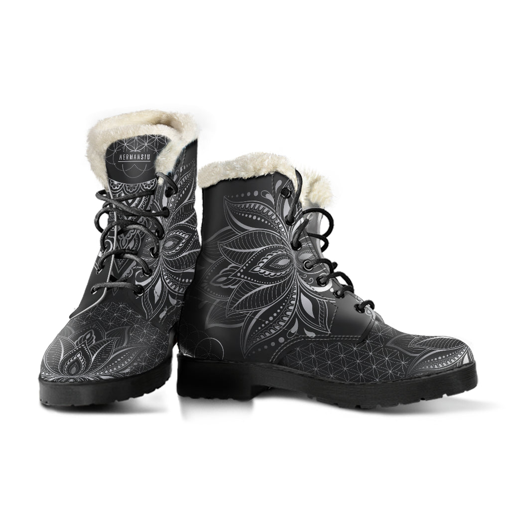 Your journey begins with a single step! Make every step count in our Black & White Faux Fur Lotus Boots!